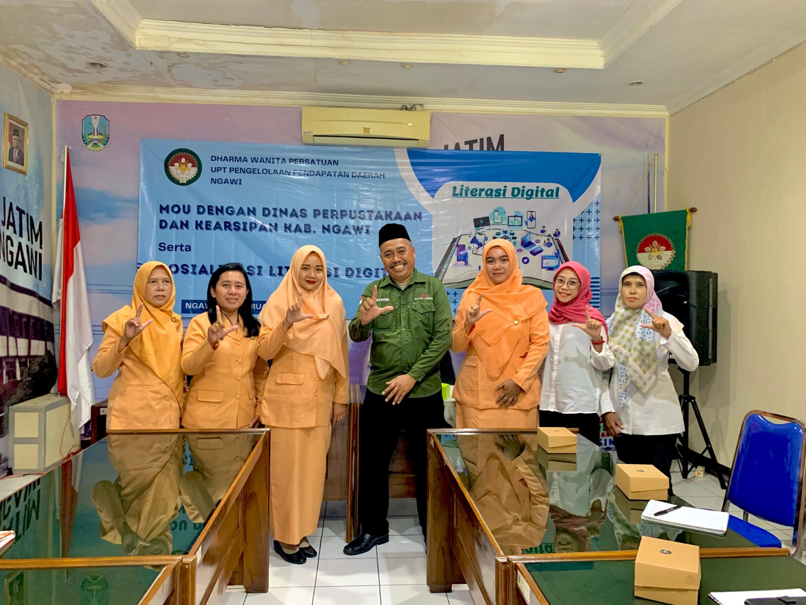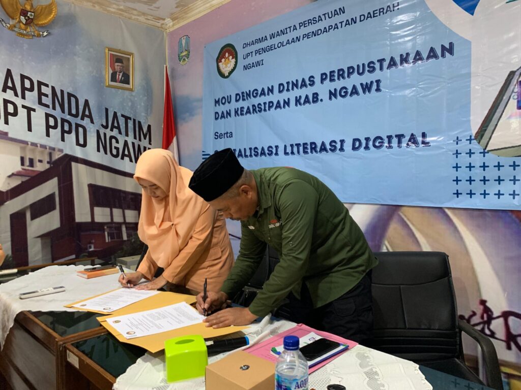 Acara ditutup dengan perpanjangan Nota Perjanjian Kerjasama (MOU) antara Dharma Wanita Persatuan UPT Pengelolaan Pendapatan Daerah Ngawi (Bapenda Provinsi Jawa Timur) dengan Dinas Perpustakaan dan Kearsipan Kab. Ngawi dan diakhiri dengan foto bersama.